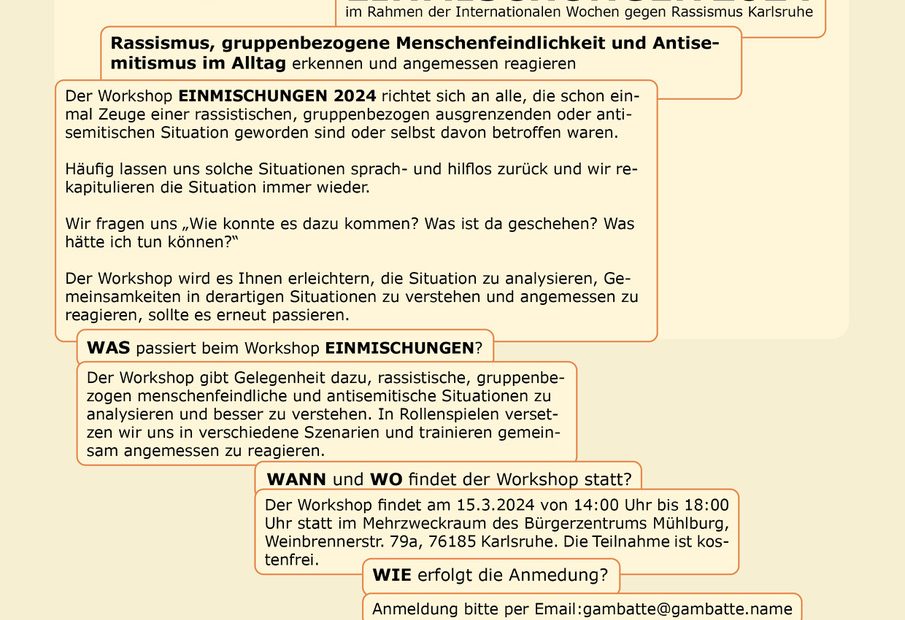 Bei diesem Intensiv-Workshop lernt ihr durch interaktive Rollenspiele alltäglichen Rassismus, gruppenbezogene Menschenfeindlichkeit und Antisemitismus besser zu erkennen und angemessen zu reagieren.